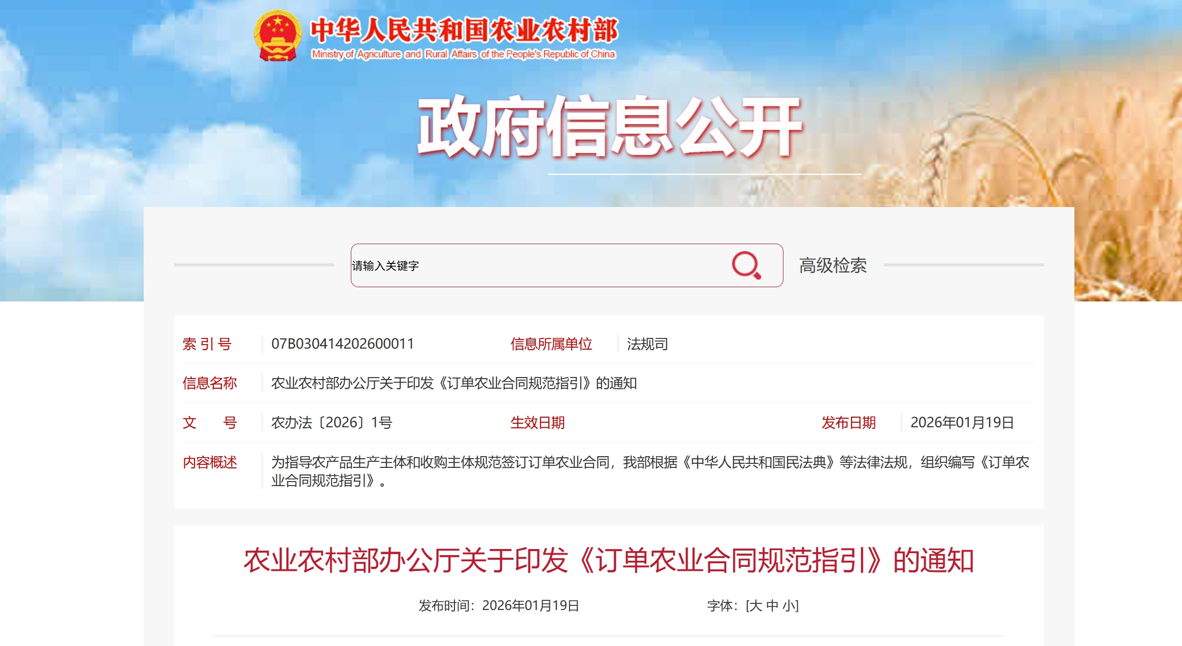 为指导农产品生产主体和收购主体规范签订订单农业合同,我部根据《中华人民共和国民法典》等法律法规,组织编写了《订单农业合同规范指引》(以下简称《指引》)。《指引》是依据相关法律规定对订单农业合同签订提供的行政指导。各地要加大《指引》宣传推广,积极指导有签订订单农业合同意向的农产品生产主体和收购主体,参照《指引》在平等自愿、协商一致的基础上依法订立合同、确定双方权利义务。要结合本地区产业发展实际,参照《指引》探索分领域发布订单农业合同示范文本,提高订单农业合同履约率,保障合同双方合法权益。要加强检验检测、涉农企业生产经营资质核查等服务,引导合同双方通过正规渠道选购农资、科学规范从事种植养殖。